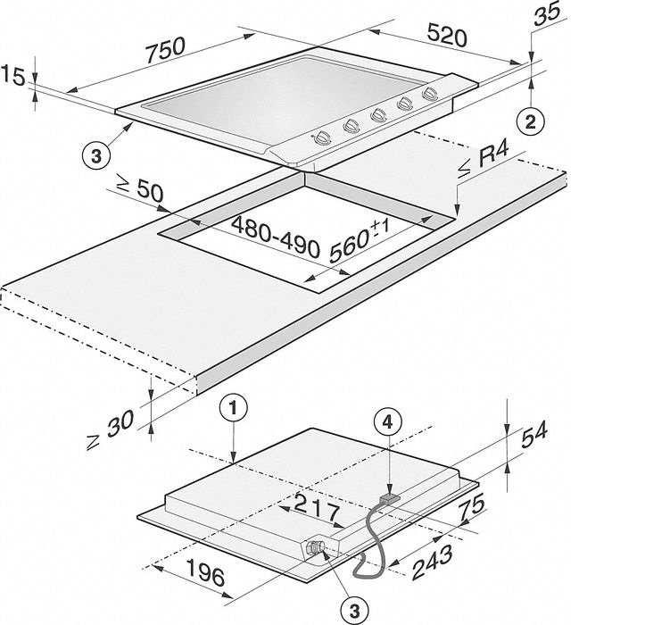 Kích thước lắp đặt Bếp Gas âm bàn Miele KM 2034