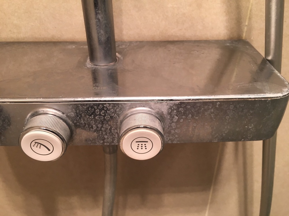 Sen tắm, Vòi lavabo, Phụ kiện mạ Crome ban đầu rất Bóng và Sáng, Sau một thời gian sử dụng bị lớp cặn Canxi màu trắng bám vào làm cho Các bộ Vòi tắm hoa sen bẩn và mất độ bóng đẹp.