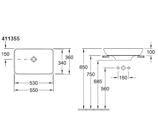 Kích thước lắp đặt Chậu Lavabo Villeroy & Boch Venticello 411355R1
