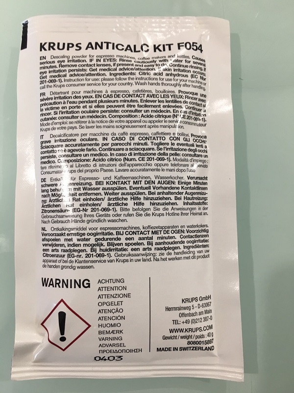 Để chạy chương trình tẩy cặn, bạn sẽ cần một thùng chứa có dung tích ít nhất là 0,6 lít và một gói Krups F054 Descaling Anti-Calc Powder. Cho bột tẩy cặn vào bình chứa nước.