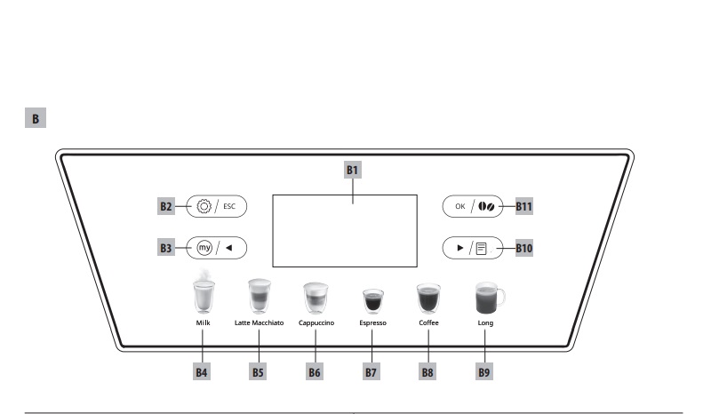 1- Nhấn nút B11 cho đến khi màn hình xuất hiện Dòng chữ: Pre-Ground Coffee