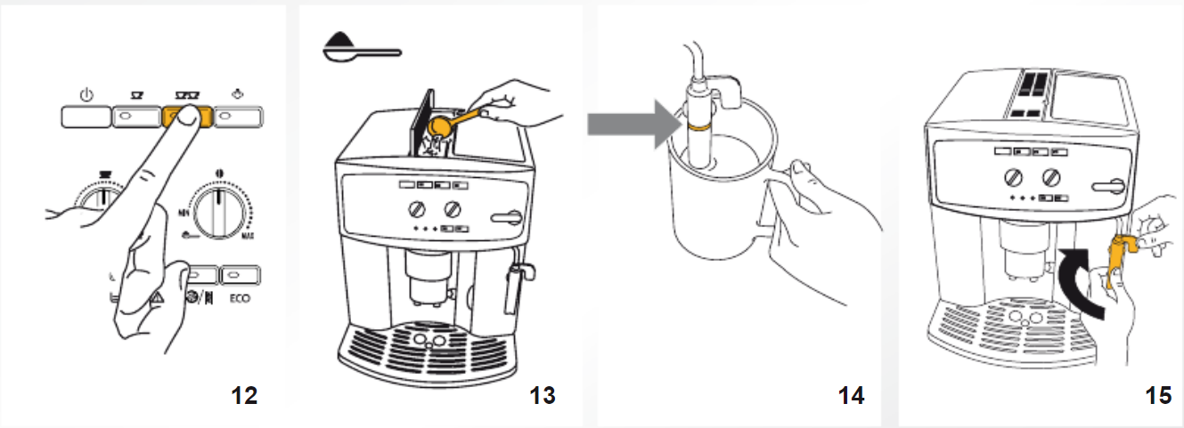 13- Muốn pha Cà phê bột, Vặn Núm Chỉnh Lượng Cà phê về Biểu tượng Thìa Cà phê đến khi đèn sáng, Mở hộc cà phê bột, Đong đúng 1 thìa Cà phê kèm theo máy. Bấm nút 1-2 Cốc cà phê để pha.