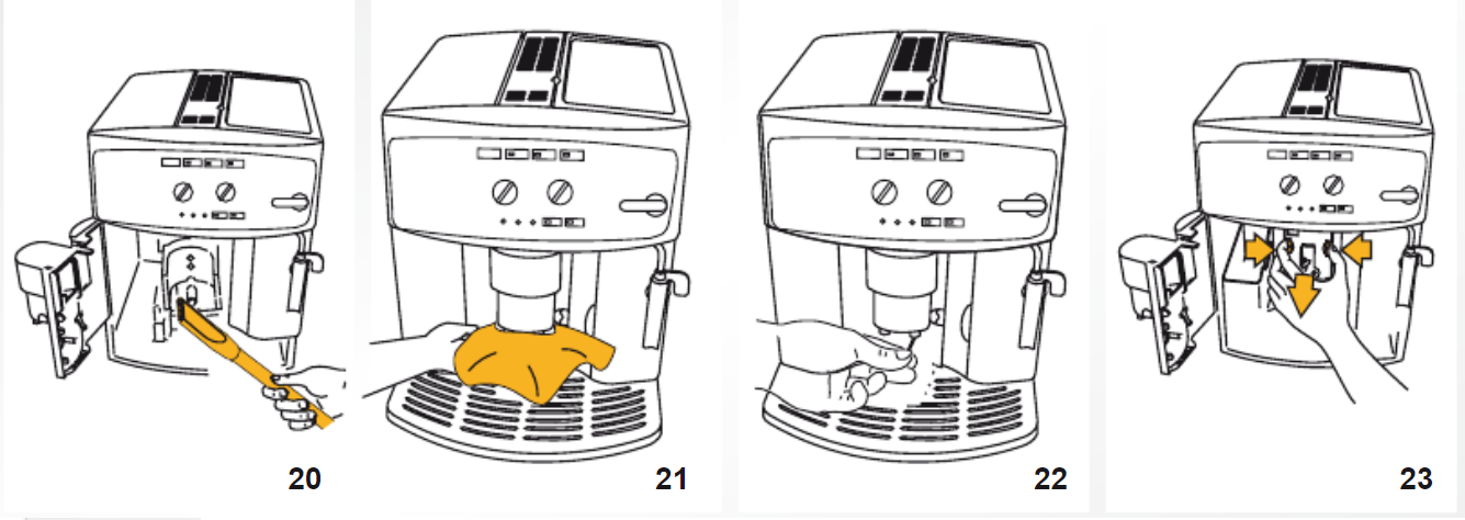 20- Thỉnh thoảng phải rút cả Cối lọc Cà phê, dùng Máy hút bụi hút sạch Bột cà phê rơi vãi bên trong máy, tránh để lâu Bị ẩm mốc Mất vệ sinh.