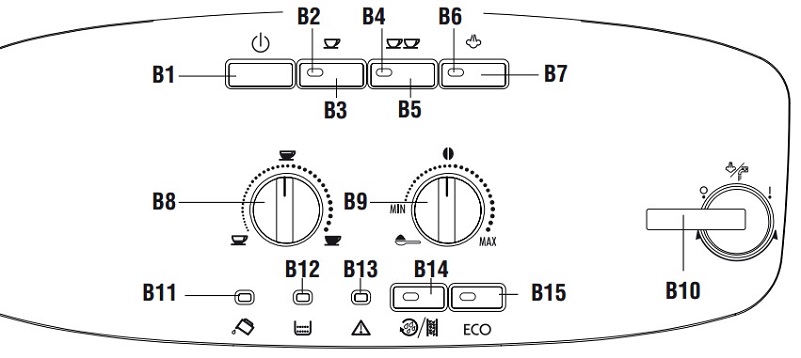14- Muốn đánh sữa pha Cà phê Sữa, Capuchino làm như sau: Bấm mở máy B1, Bấm Nút Hơi B7 Chờ đèn B6 hết nhấp nháy, Mởi van hơi (vị trí I), Sục hơi đến khi nhiệt độ Cốc sữa 65 độ thì đóng Van hơi lại (Vị trí O).