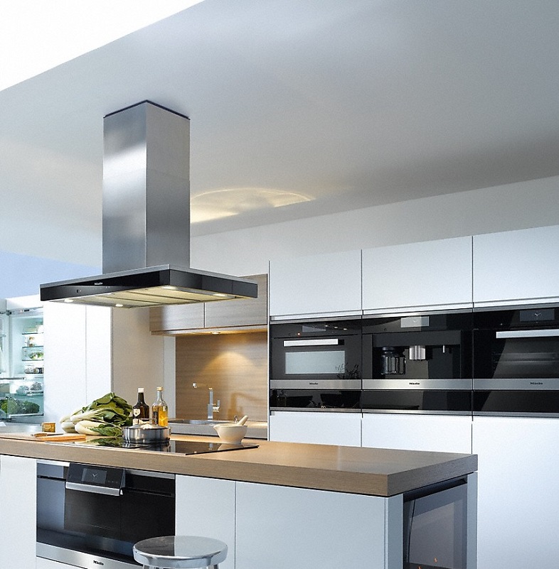 Máy hút mùi âm tường và bếp đảo Miele có thể điều chỉnh được độ cao phù hợp so với bếp trong quá trình lắp đặt. Đúng