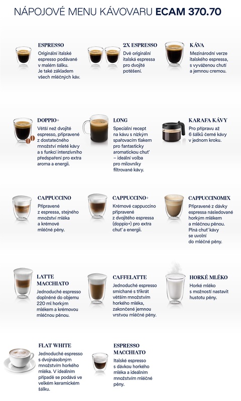 Các loại cafe sữa: Cappuccino, Latte Macchiato, Cappuccino +, CappuccinoMix, Sữa nóng, CaffeLatte, Flat White, Espresso Macchiato