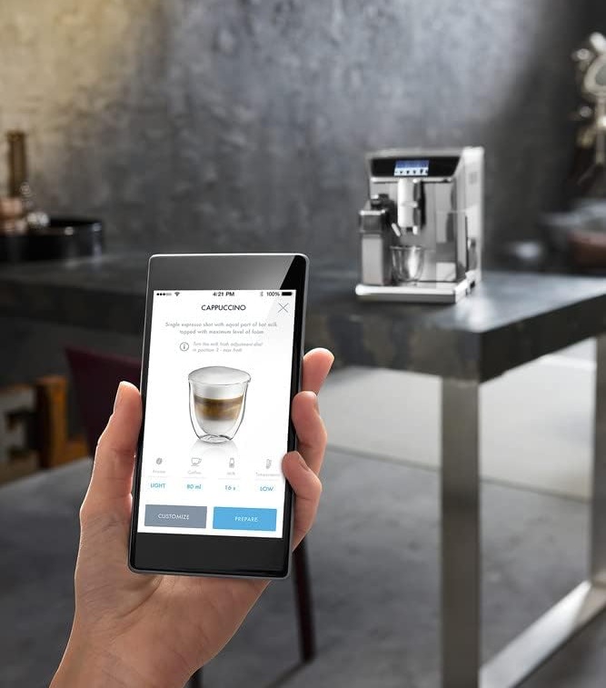 Ngoài màn hình cảm ứng TFT 4.3 inch cm có màu, bạn có thể điều khiển máy thông qua điện thoại thông minh hoặc máy tính bảng. Các ứng dụng thông minh Máy pha cà phê hiện có sẵn cho các thiết bị iOS và Android .