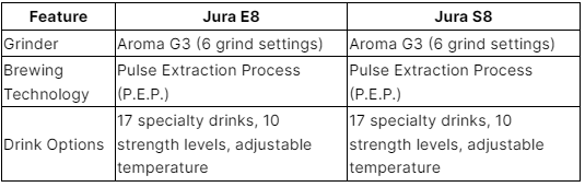 Tuy nhiên, Jura S8 tự hào có một số điểm nhấn cao cấp, chẳng hạn như nắp phễu mạ crôm và vòng đệm hương thơm, mang lại cảm giác cao cấp hơn. Ngoài ra, S8 còn có máy xay Aroma G3 thế hệ mới hơn, trong khi E8 sử dụng model thế hệ trước.
