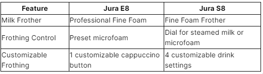Khi nói đến việc tạo bọt sữa và đa dạng đồ uống, Jura E8 và S8 đáp ứng các sở thích và nhu cầu khác nhau. E8 tự hào có chức năng Cappuccino một chạm, cho phép tạo bọt sữa tự động dễ dàng với máy tạo bọt chuyên nghiệp Fine Foam. Chất tạo bọt này có khả năng điều chỉnh kết cấu và kiểm soát nhiệt độ, đảm bảo luôn tạo ra bọt xốp mịn như nhung.